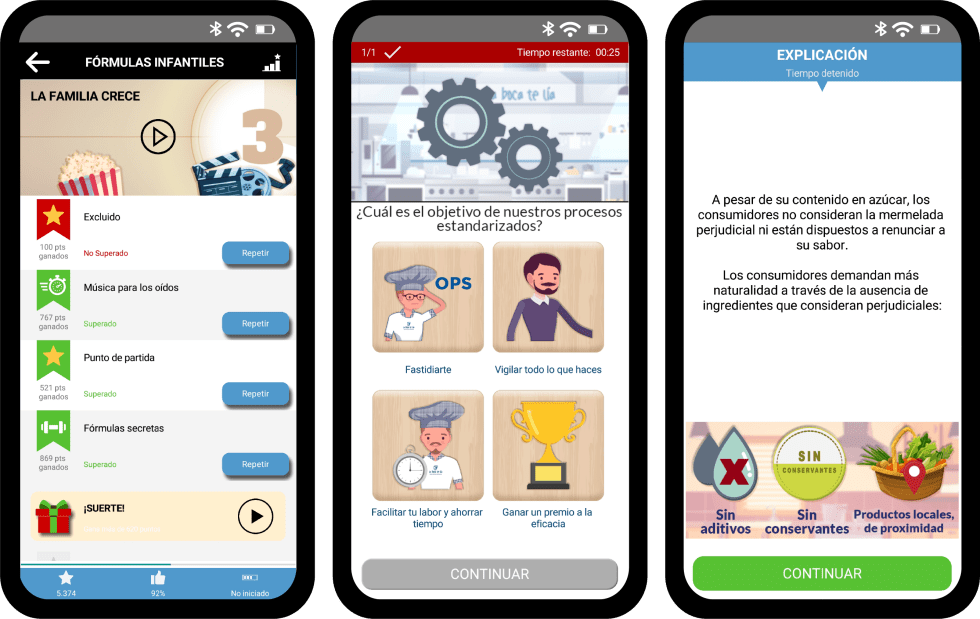 - instant power-ups : juegos de preguntas y respuestas instantáneos y de rápida ejecución que nos permiten trabajar sobre los refuerzos de conocimiento y comportamiento en el tiempo. De una manera atractiva, sencilla y ligera para el usuario